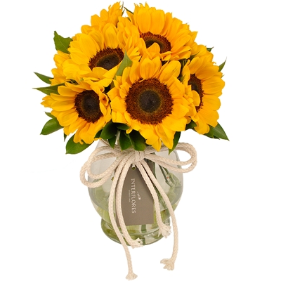 Lindíssimo Arranjo com 12 Girassol para Entrega em delicado vaso vidro, ideal para presentear em qualquer ocasião. Os girassóis representa altivez, luz e muita energia positiva.