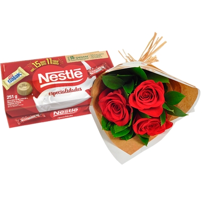 Para as apaixonadas de plantão por Rosas e Chocolates, este Buquê com 3 Rosas Vermelhas Importadas e Chocolates Nestlé, é o presente perfeito para demonstrar todo seu amor!