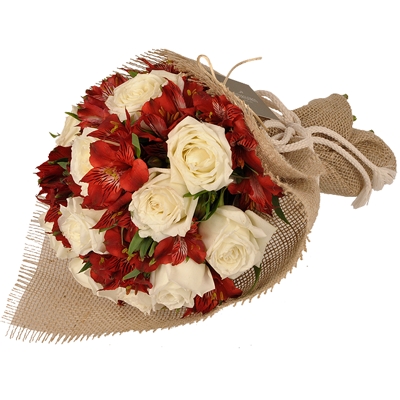 Maravilhoso Buquê com 15 Rosas Brancas Para Presente, e astromélias vermelhas. Uma delicada composição de flores frescas, para você presentear seja em qualquer ocasião, aquela pessoa especial em sua vida.