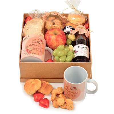 Presenteie a sua mamãe ou mesmo aquela pessoa querida, com esta cesta de café da manhã artesanal. São duas caixas de madeira, uma com delicioso bolo caseiro (bolo da vovó) e outra caixa com suco, pães, biscoito caseiro, frutas e caneca de porcelana personalizada. Ela vai amar esta linda cesta!!