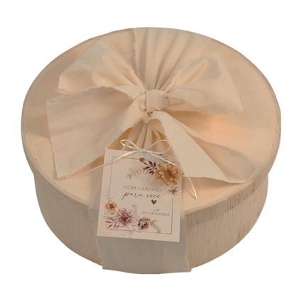 . 01 Caixa madeira redonda com tampa, decorada com laço de fita rústica, e embalada com celofane para presente.