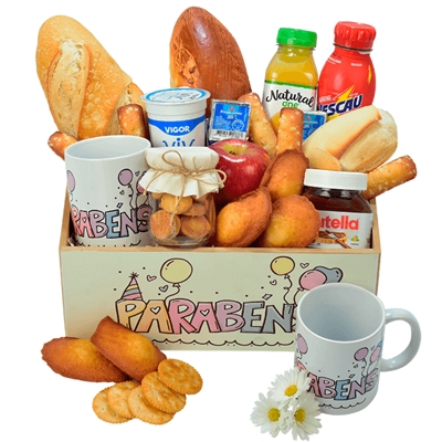 É maravilhoso ser surpreendido ou surpreendida, com uma linda e deliciosa cesta de café da manhã, em uma data especial como aniversário, não é mesmo? Esta é nossa sugestão: Uma linda cesta de café para aniversariante, recheada de deliciosos pães, biscoitos, caneca personalizada com a descrição "Parabéns" e muito mais...