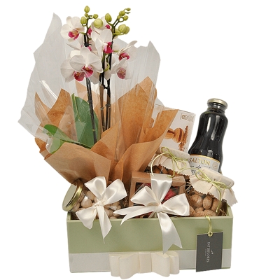 Linda e requintada cesta para Presente com Mini Orquídea, biscoitos caseiros, suco e outras delícias para um chá da tarde, um café da manha diferenciado ideal para qualquer ocasião. Uma excelente opção de presente para comemorar aquela data especial, como final de ano, dia da mulher, dia dos avós, ou aniversários! Aproveite o desconto especial, e mande esta cesta ainda hoje!