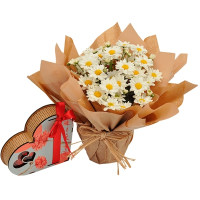 Gracioso vaso de margarida plantado branco, com uma caixa de chocolates ao leite crocantes e deliciosos!